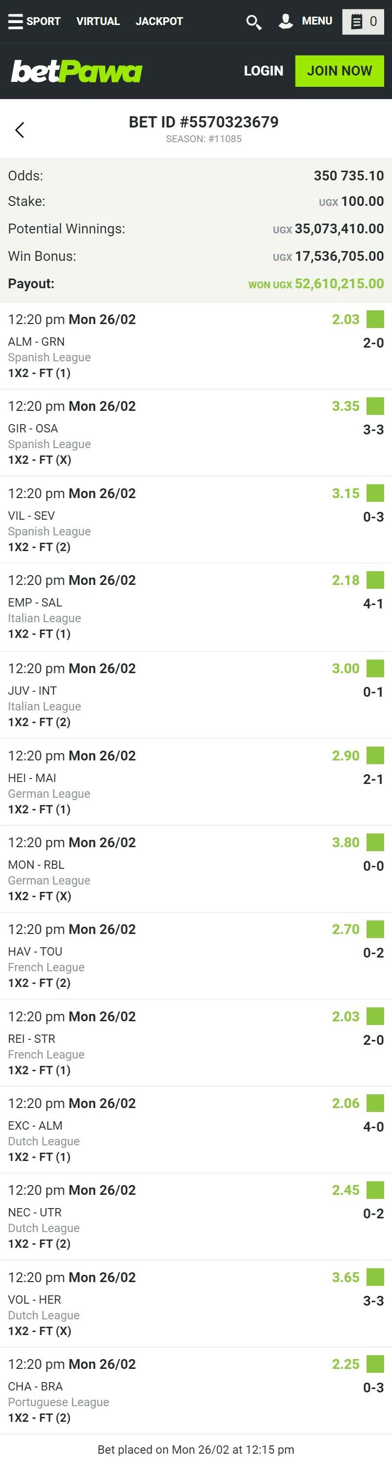 I have been betting with betPawa for some 2 good years, mostly on Virtuals because they are played for 1 minute and the next round starts in 5 minutes so, if you win, just after 1 minute you receive your winnings on your betPawa account balance, The minimum stake of UGX 1 is so good as well.